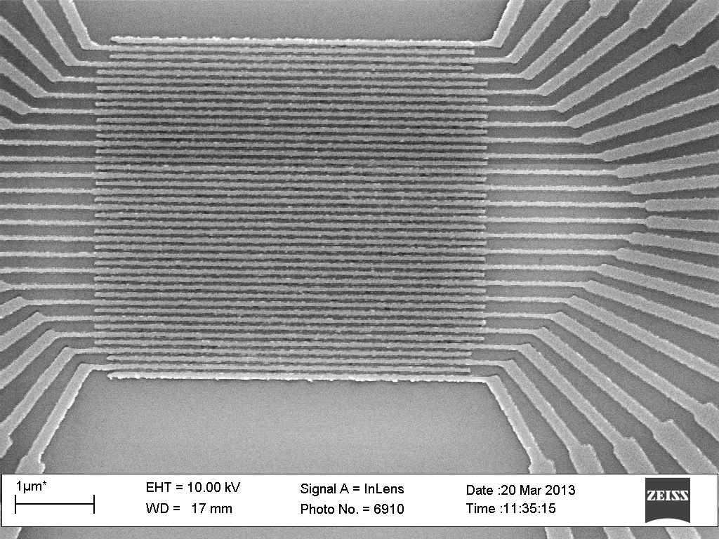 To make this sample, we spread nanowires on the surface of a silicon chip, then took pictures of them using an electron microscope. Based on the pictures we designed gold contacts are wrote them over the wire using electron beam lithography. The device in the picture was the first where we managed to send a current through a nanowire. A small step for mankind, a great step for a new lab.