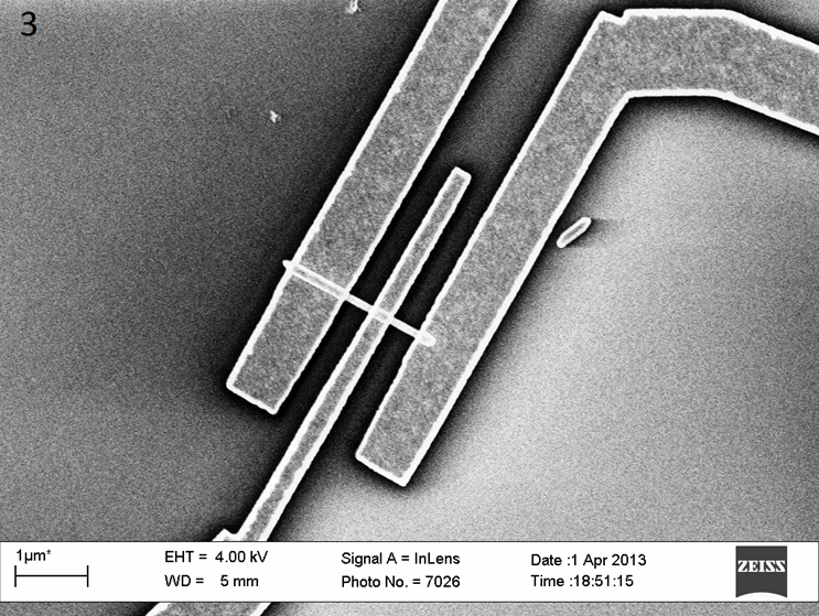 This picture shows a semiconductor nanowire grown in Eindhoven that we contacted with gold leads. Because all of our measurements are “transport”, i.e. sending a current through a nanostructure, these contacts are absolutely necessary for us to go forward.