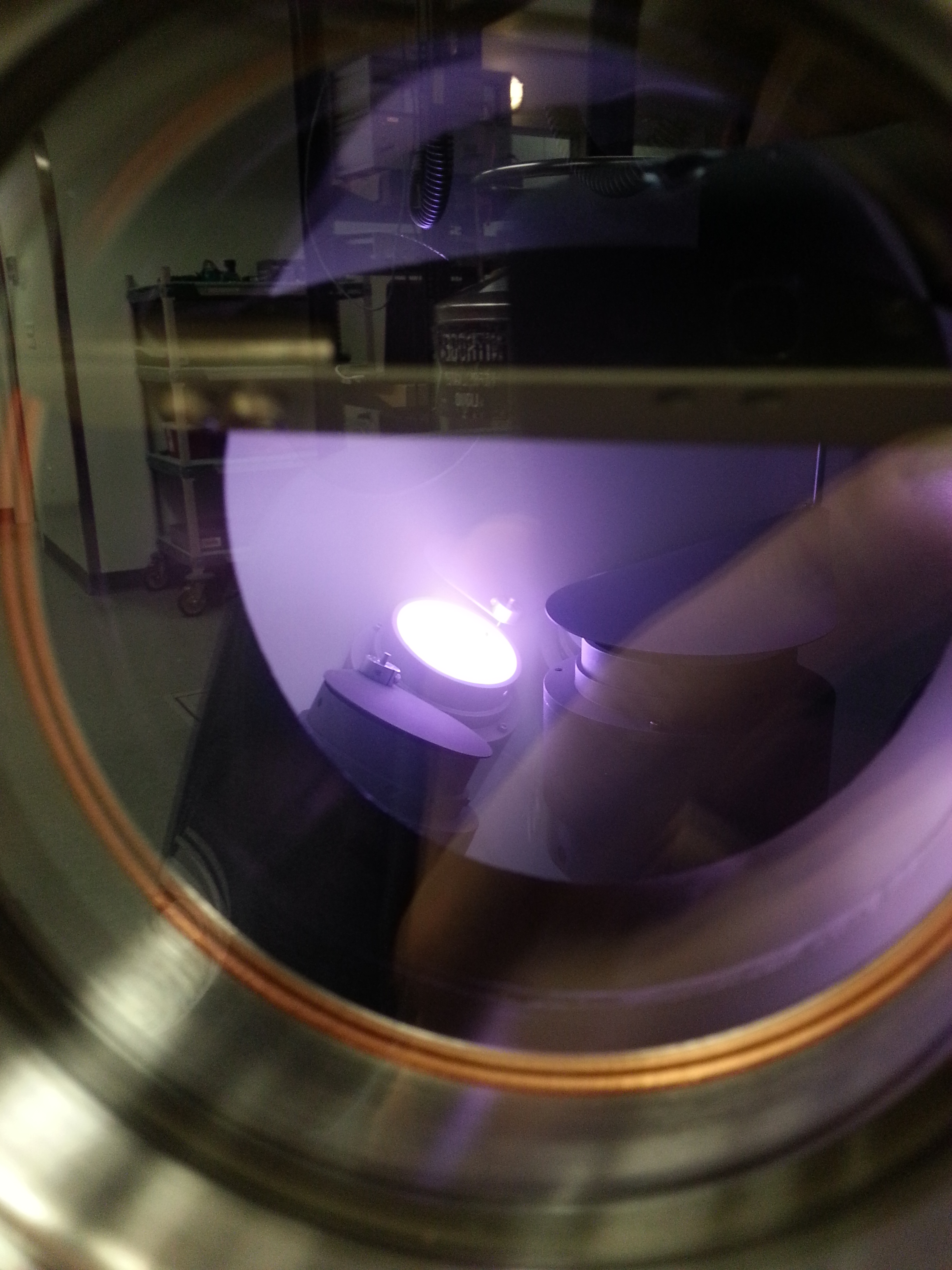 This is a sputtering machine. It is a high vacuum system inside of which argon plasma kicks atoms out of a target, after which the target atoms land onto a sample creating high quality thin films of metals or dielectrics.