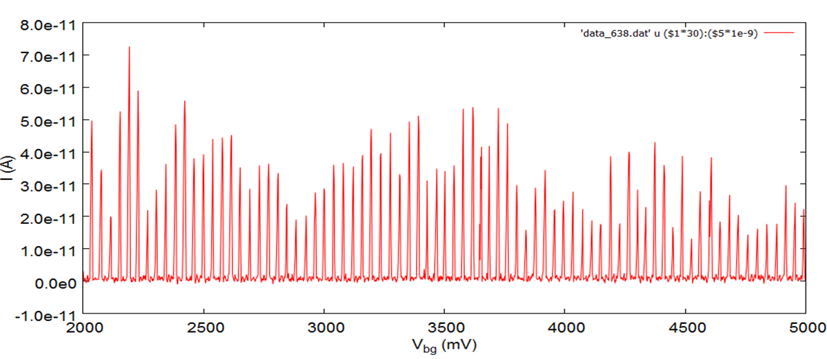In this case this so-called Coulomb blockade was obtained in a nanowire device contacted by two electrodes and tuned by an electrostatic gate, for which purpose the silicon substrate was used. This is one of the first low temperature measurements performed in our new lab in Pittsburgh.