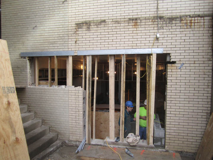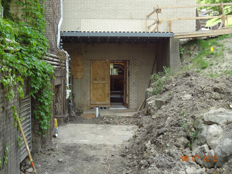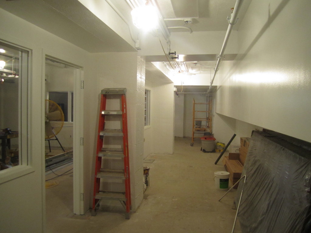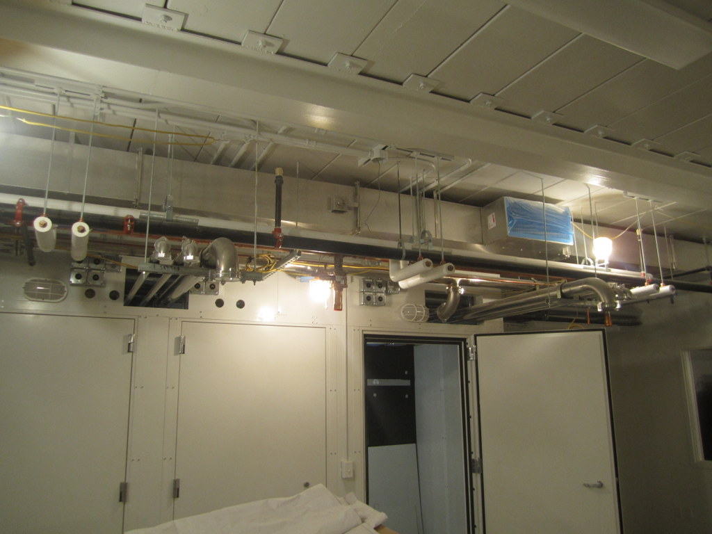 Fridge room. The trench is covered by wood, eventually will be aluminum grids. At the ceiling you can see two rails for a crane.