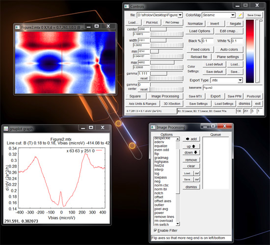 The data sets are in simple X-Y-Z matrix format. They are currently set up for a nifty standalone called Spyview, developed by Gary Steele and Oliver Dial. Spyview is the iPad of plotting. It has been designed by data-takers for data-takers to reach the natural ease of comprehension even for complex data sets. I especially enjoy the slider that adjusts gamma in color plots.
