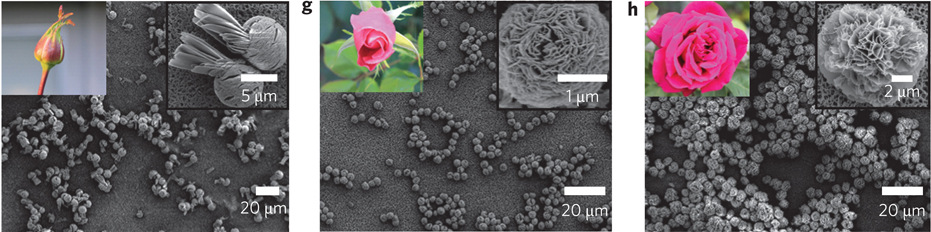 These amazing nanostructures are nanoflowers. We first thought that this was nanocabbage, but after reading the paper we had to concur. The authors carefully compared their structures with images of roses and made the stunning similarity abundantly obvious.
