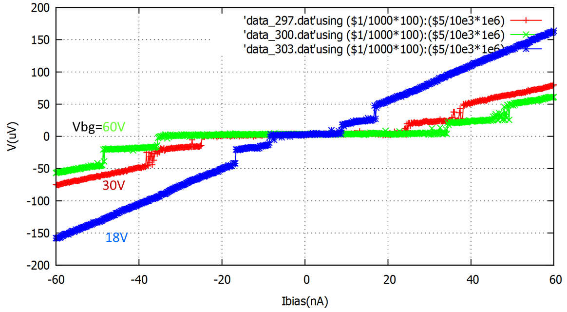 This graph shows the flow of electrical current without developing a voltage (supercurrent) through a semiconductor coupled to two superconductors. The size of the maximum supercurrent (called critical current) can be controlled by a voltage on a nearby electrode (gate).