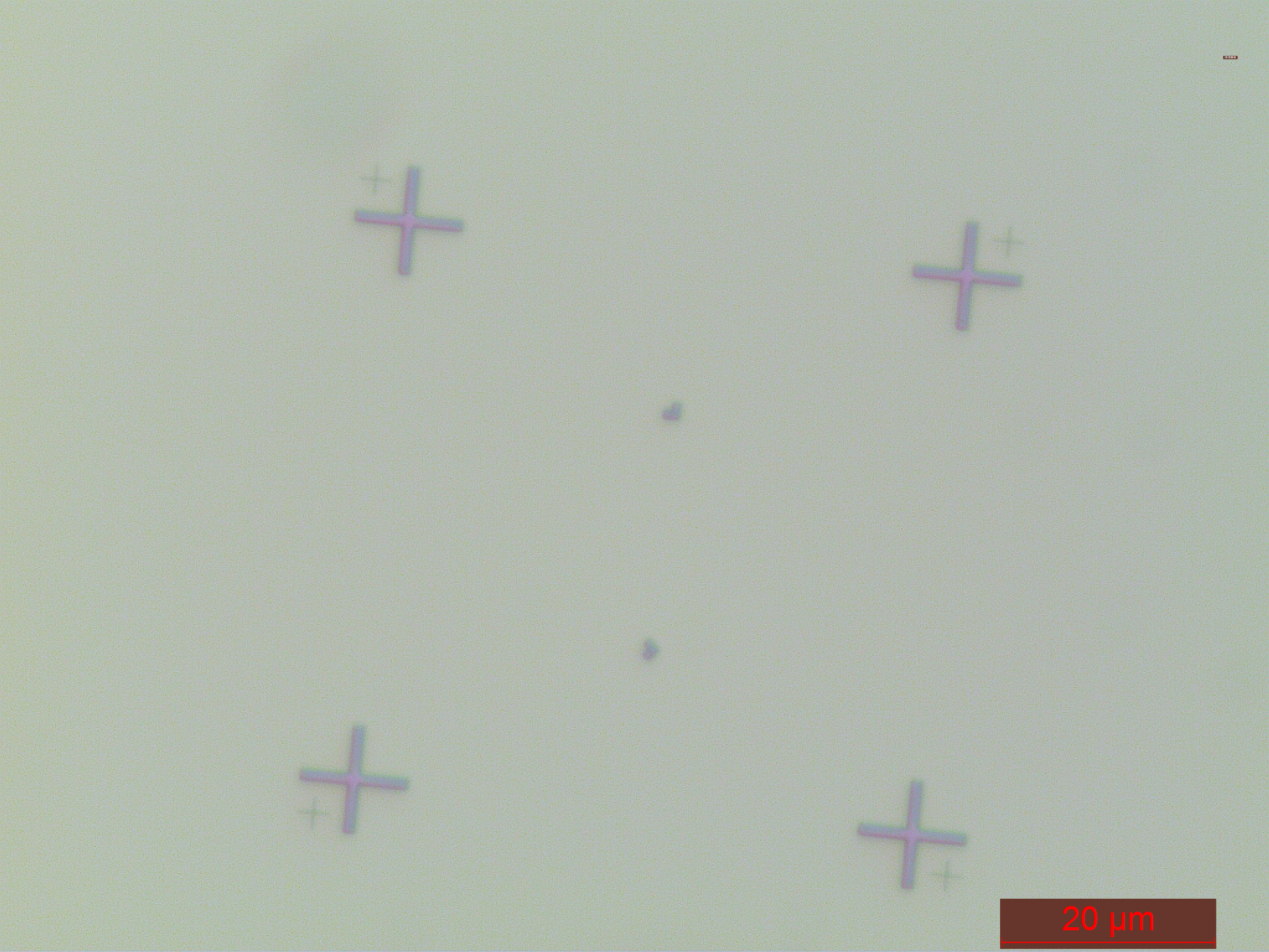 We start by preparing the substrates. Here again our recipe is a little extravagant as we shall be using substrates from France, but you can use substrates from your local market. We prepare a whole 2” wafer and then cut it into smaller pieces for final devices. The fist step is to fabricate markers, they are needed as coordinates and reference points for other layers of nanofabrication. They are produced by electron beam lithography which can define the cross-shaped patterns shown below. Make sure you spin PMMA before doing lithography, and then develop it in MIBK for about a minute.