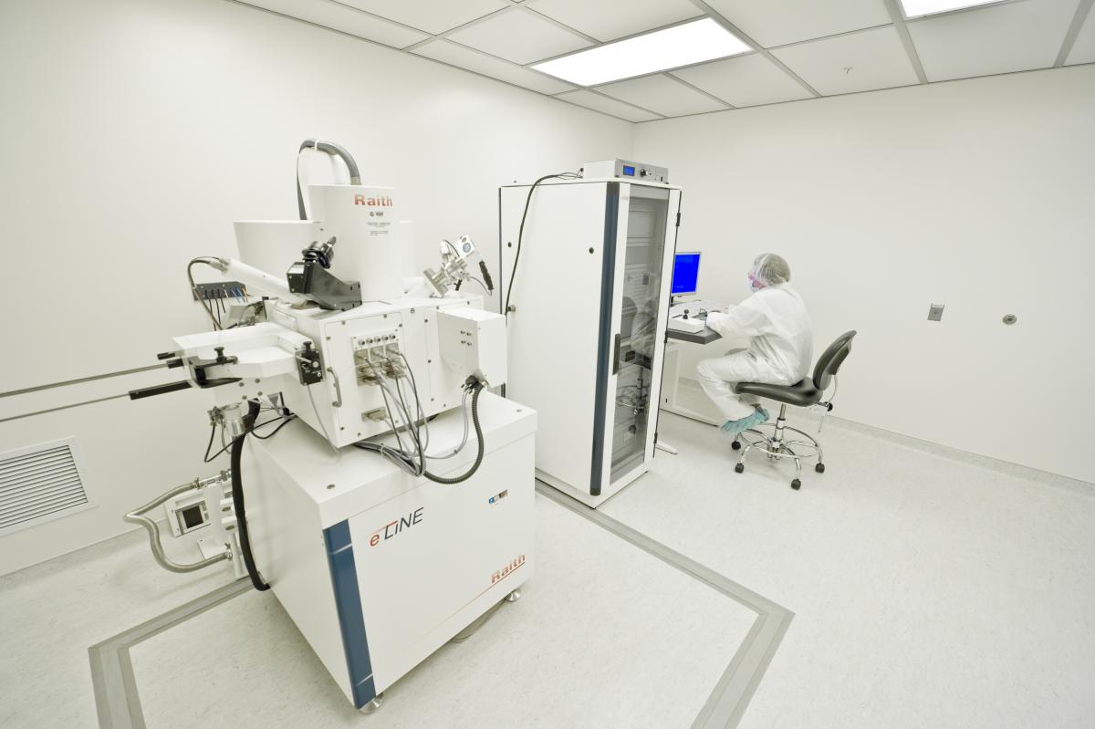 We use the electron beam lithography machine shown in the picture above to write the pattern of contacts on top of the nanowire. The substrate and the wire are coated with PMMA which is a polymer that gets broken down by a beam of electrons during lithography. Where the molecules of PMMA were broken they come off in MIBK leaving openings. Metals like titanium and gold can be deposited in those openings.