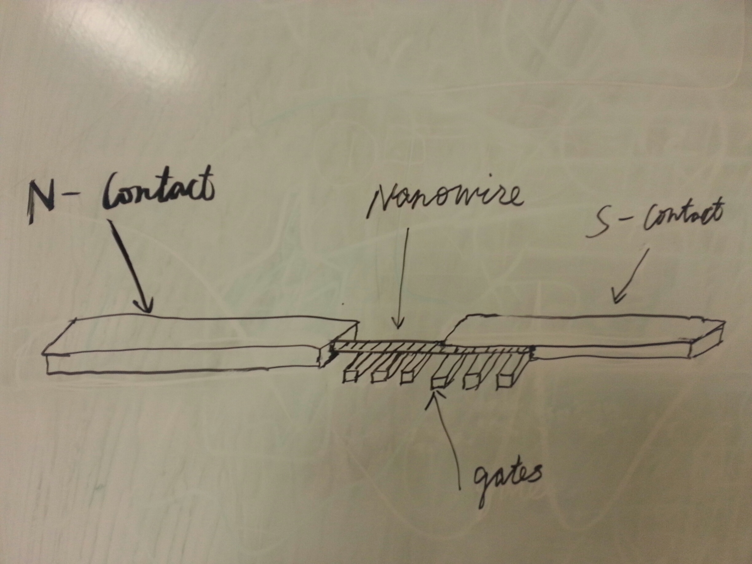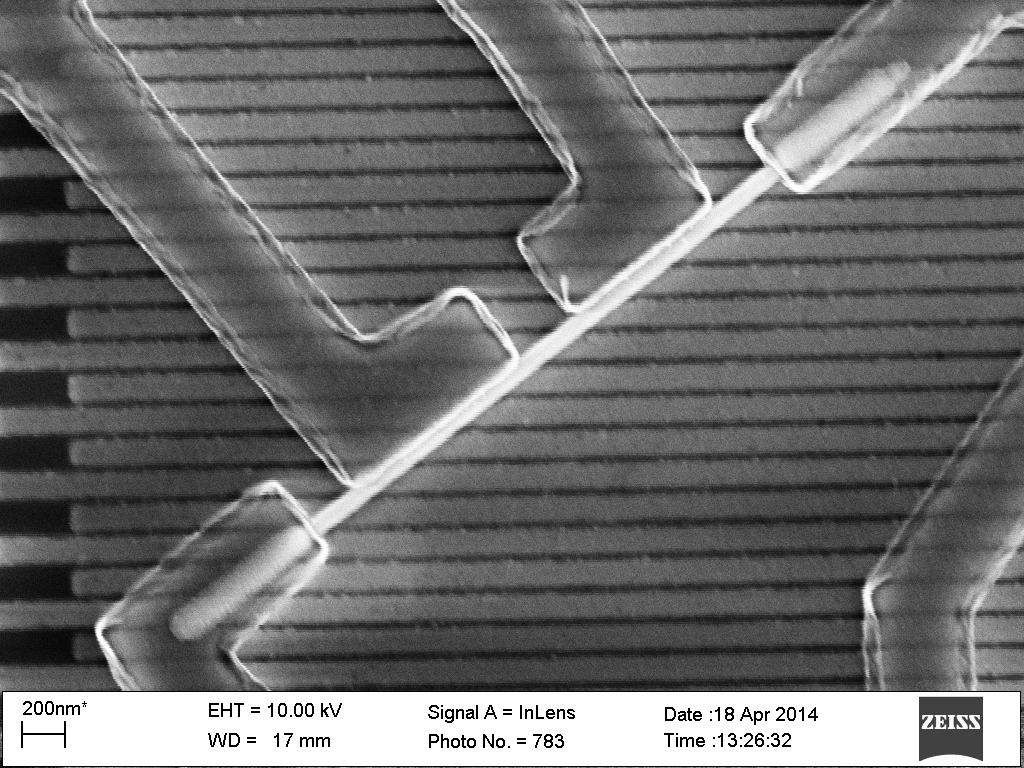 The nanowire is a bright white object in the center. You can also see better the gates in the picture above because this picture is taken with a scanning electron microscope. Although these pictures are always in grayscale reflecting the color of electrons.